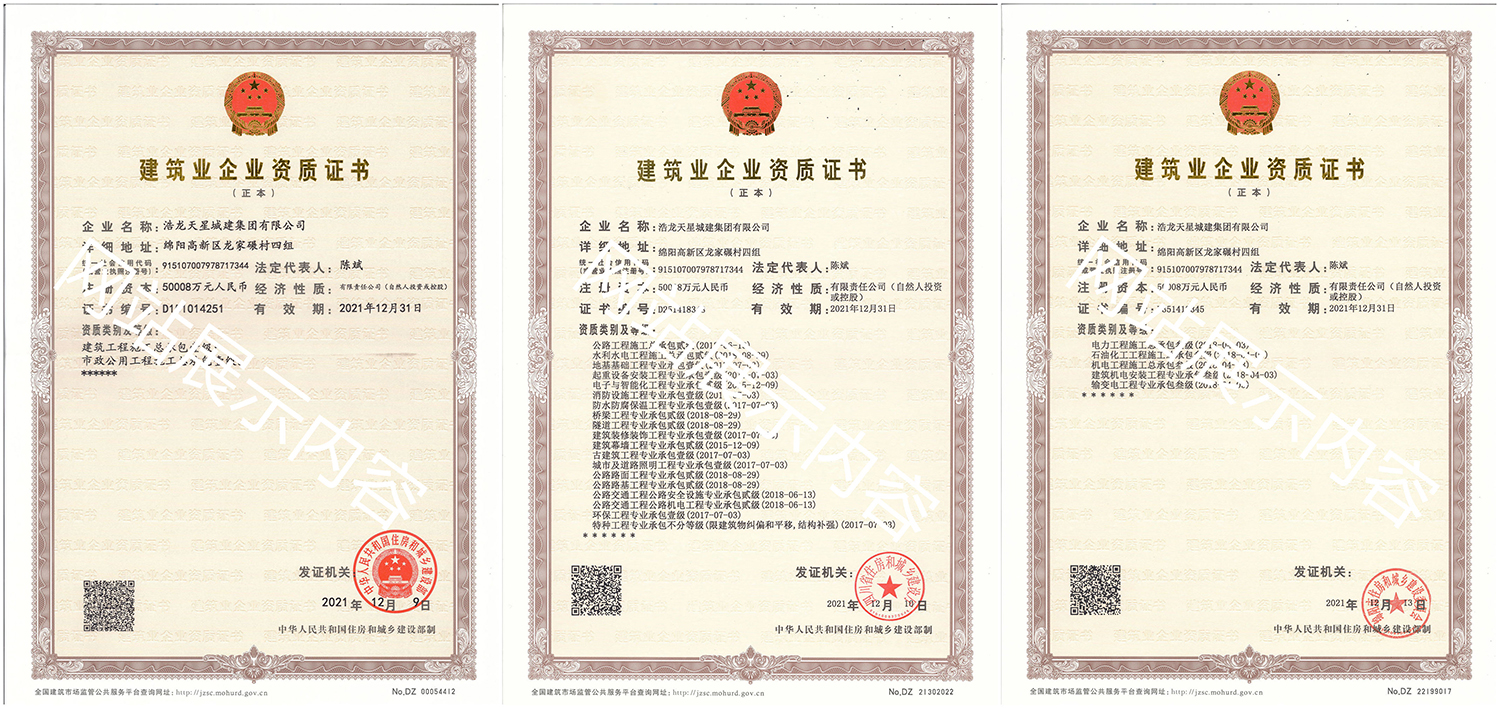 浩龍?zhí)煨浅墙瘓F(tuán)有限公司,2007年成立于“李白故鄉(xiāng)、中國科技城”—四川省綿陽市,企業(yè)注冊資本金5.0008億元。公司共有27項建筑業(yè)企業(yè)資質(zhì),其中國家一級資質(zhì)11項,二級資質(zhì)10項,三級資質(zhì)5項,特種資質(zhì)不分等級1項,類別涵蓋建筑、市政、水利、機(jī)電、隧道、起重設(shè)備安裝等基礎(chǔ)及未來發(fā)展重點(diǎn)專業(yè)。公司下設(shè)三個辦事處,業(yè)務(wù)范圍輻射全國,在建項目三十余個,累計完成產(chǎn)值超11億元。公司是綿陽市建筑施工企業(yè)協(xié)會副會長單位、綿陽遂寧商會會長級單位、綿陽首批建筑業(yè)綠卡企業(yè),在綿陽本地企業(yè)中綜合實(shí)力名列前茅。
